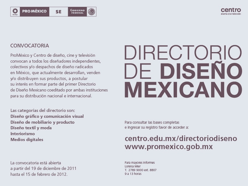 La escuela Centro a lado de ProMéxico están coeditando un Directorio de Diseño Mexicano que se distribuirá a nivel nacional e internacional. Les compartimos el flyer para que puedan consultar las categorías bajo las cuales se pueden anuncias y las bases para lograr registrar su negocio.