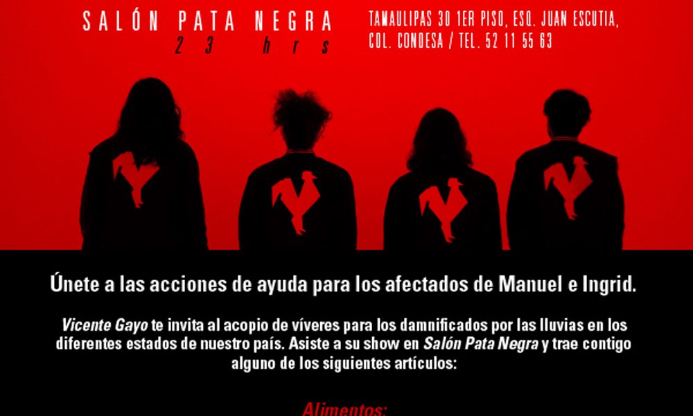 El día de mañana, la agrupación mexicana se presentará en el Salón Pata Negra de la Condesa (Tamaulipas #30 esquina con Juan Escutia). Sabemos que las tocadas del Pata no llevan precio, pero esta vez lo único que Vicente Gayo pide, es que quienes vayan a verlos los apoyen llevando alguno de los artículos que están enlistados en el flyer de arriba.